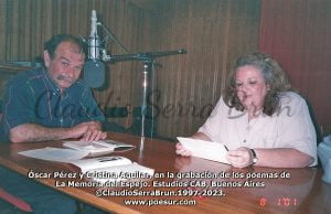 Escritor, locutor y dramaturgo, Óscar Pérez se ha desempeñado en múltiples facetas de la información y la creación literaria: libro Rito de Anunciación, obra teatral Los viudos de Gardel, drama en dos actos estrenada en España (1991), la serie para televisión Cuentacanto, emitida en TVE en 1991, numerosos programas radiales. La voz y la creatividad de Óscar Pérez confieren a la Memoria del Espejo la musicalidad de la otra orilla inmensa del español. |